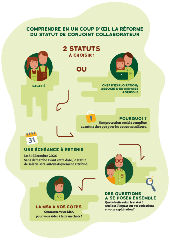 Le statut de conjoint collaborateur est limité à une durée maximale de 5 ans. Toute personne ayant ce statut depuis le 1er janvier 2022 ou avant cette date devra y mettre fin au plus tard le 31 décembre 2026. Au-delà de cette date, pour continuer à travailler sur l’exploitation, il sera nécessaire d’adopter un autre statut : salarié, chef d’exploitation ou associé d’entreprise agricole. Ce choix est essentiel pour reconnaître l’engagement professionnel du conjoint et garantir ses droits sociaux. La MSA vous accompagne pour comprendre les enjeux et anticiper les démarches.